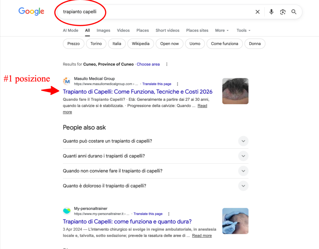 RISULTATI: #1 posizione per la parola chiave “trapianto capelli” – 22.200 ricerche mensili.